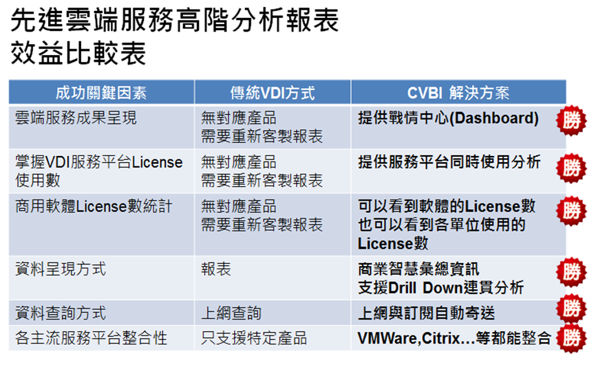 能整合市面上主流雲端服務,例如VMware VDI, Citrix XenApp & VDI, Microsoft RmoteApp & VDI ,您可以彙整這些服務平台的資訊,讓分析資料成為您最完整也最具參考價值之管理依據。